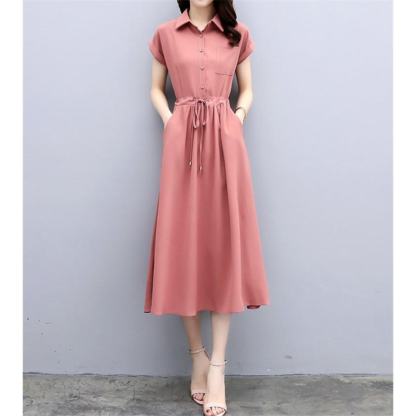 カジュアル コットン 折り襟 半袖 無地 ハイウエスト ワンピース Andapt Com